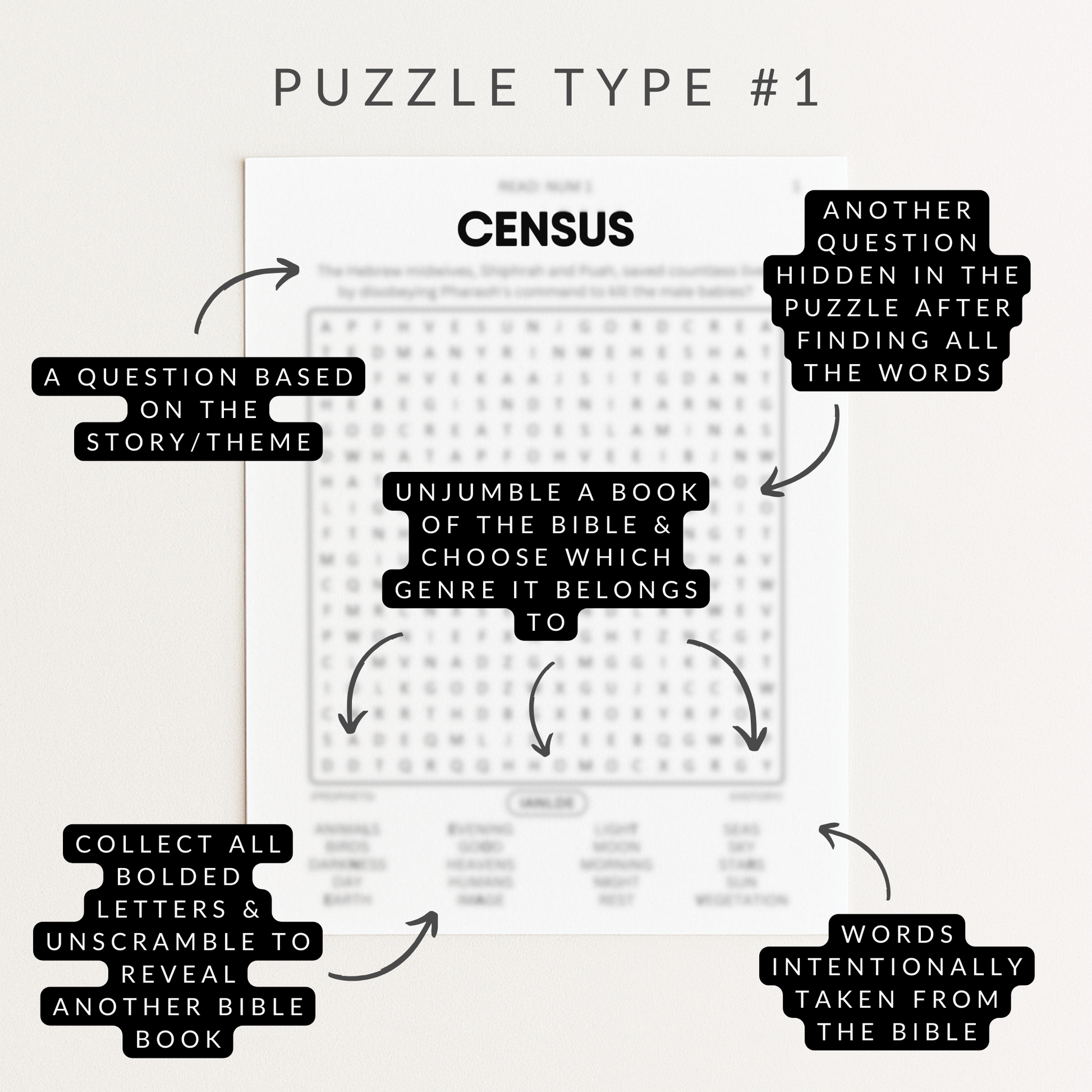 Our second set of Word Search Puzzles utilize the same set of story words in the word bank, but present a brand new puzzle to solve along with a new and totally different hidden Bible question to uncover. We stepped things up by removing the titles from the puzzles to push you to use the word bank to figure out the story’s theme. (Don't worry, we changed the order so you can't sneak a peek at the previous page!) We added an additional four hidden books of the Bible in the word search puzzle to find. You'll also need to label their genre and testament.